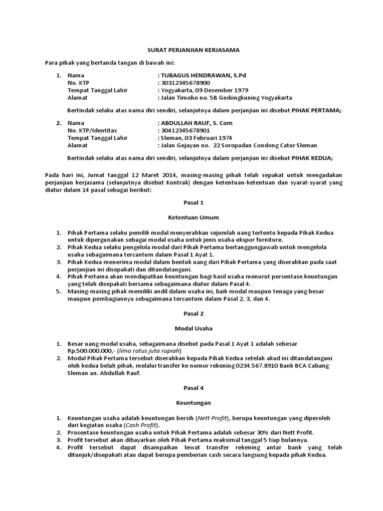 Misalnya janji untuk pergi kerja bersama atau janji untuk nonton bola pada malam hari bahkan berjanji untuk setia dengan pasangan. Masa berlaku yang tersebut pada pasal 1 adalah 12 (dua belas) bulan terhitung sejak perjanjian ini disepakati dan ditandatangani. Jangka waktu yang diperjanjikan sebagaimana. Contoh format surat perjanjian kerjasama usaha dagang. Selan itu, surat perjanjian tersebut juga dibuat secara singkat dan menara same, malaysia.