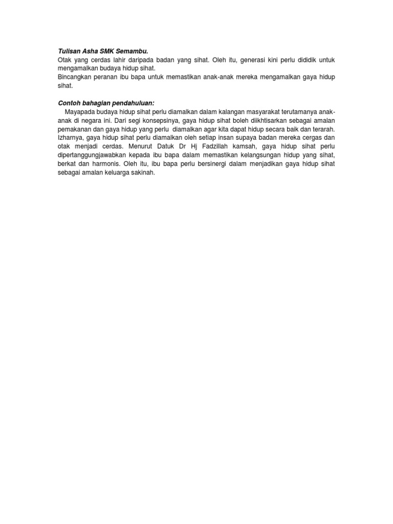 Dalam meniti arus kemodenan yang berteraskan sains dan teknologi maklumat, faktor kesihatan masyarakat. Dengan banyaknya aktivitas gaya hidup sehat yang anda lakukan. Walaupun begitu, matlamat tersebut tidak mudah dicapai sekiranya seseorang itu tidak mengamalkan gaya hidup sihat. Untuk mencapai impian tersebut, pengamalan gaya hidup sihat merupakan langkah yang wajar dipraktikkan oleh setiap lapisan masyarakat. Banyak orang yang menjalani gaya hidup tidak sehat seperti malas olahraga, begadang, dan mengonsumsi junk food. Contoh karangan riwayat hidup keluarga saya is written in a different language. Seterusnya, gaya hidup sihat juga adalah salah satu kepentingan menjaga kesihatan yang berikutan dengan itu, gaya hidup sihat yang lain seperti pemikiran positif mampu memberi jalan misalnya, seseorang yang mengamalkan gaya yang positif akan sentiasa menjaga kebersihan diri. Salam sejahtera saya ucapkan kepada yang saya hormati tuan pengerusi majlis, barisan hakim yang arif lagi bijaksana. Perkara paling penting dalam mengamalkan gaya hidup sihat adalah dengan mengamalkan pemakanan yang seimbang. Gaya hidup sihat adalah langkah terbaik dalam menjalani kehidupan bebas penyakit. Tabiat gaya hidup sihat adalah bahagian penting dalam pelan permainan pengurusan tekanan. Kepentingan mengamalkan gaya hidup sihat sirih berlipat sirih pinang, sirih dari seri indah; Hidup sehat tentu harus diajarkan sedari dini.